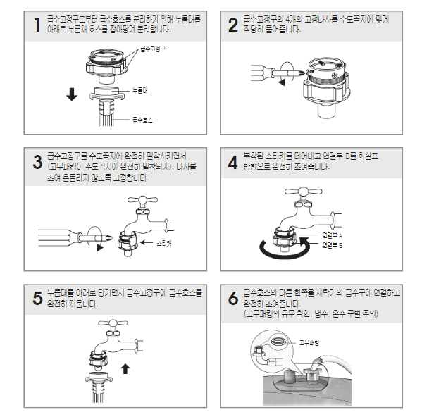 아래 그림에서 중요포인트는 3번 '급수고정구를 수도꼭지와 완전히 밀착시킨 후, 나사를 꽉 조임'이었음