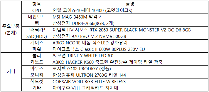 보통 게임한다고 PC를 사는 분들은 2K에 144프레임에서 안정적으로 구동되는 정도를 선호하는 것 같다. 이런 케이스엔 i7-10700급 이상 CPU+B460급 이상 메인보드+RTX 2070 SUPER급 이상 그래픽카드로 구성해야 할 듯.