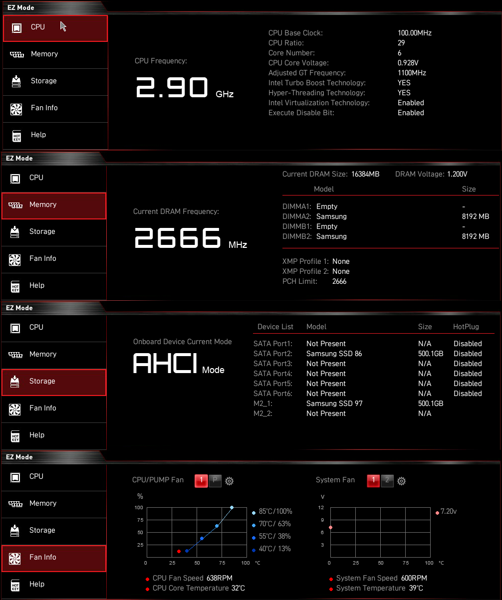 - 아래는 바이오스에서 체크해 본 하드웨어들, 화면 출력 잘되고, CPU 6코어 전부 인식되고, 램 2,4번 정상인식, M.2 SSD와 SATA SSD도 정상인식, CPU팬과 후면팬도 잘 돌아가고, 메인보드 발열도 30~40도 근처로 특별한 문제는 없어보인다.