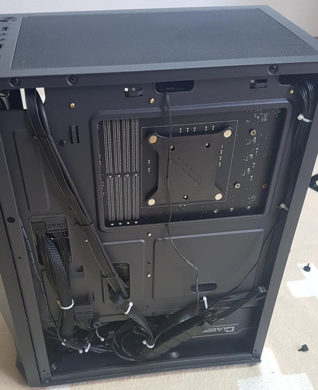 - 메인보드를 올리고 나사 체결해 메인보드를 고정해주고, 케이스 상단에서 나오는 케이블류(오디오, USB 등)는 측면으로 빼준다(추후 메인보드에 꼽고 선정리)